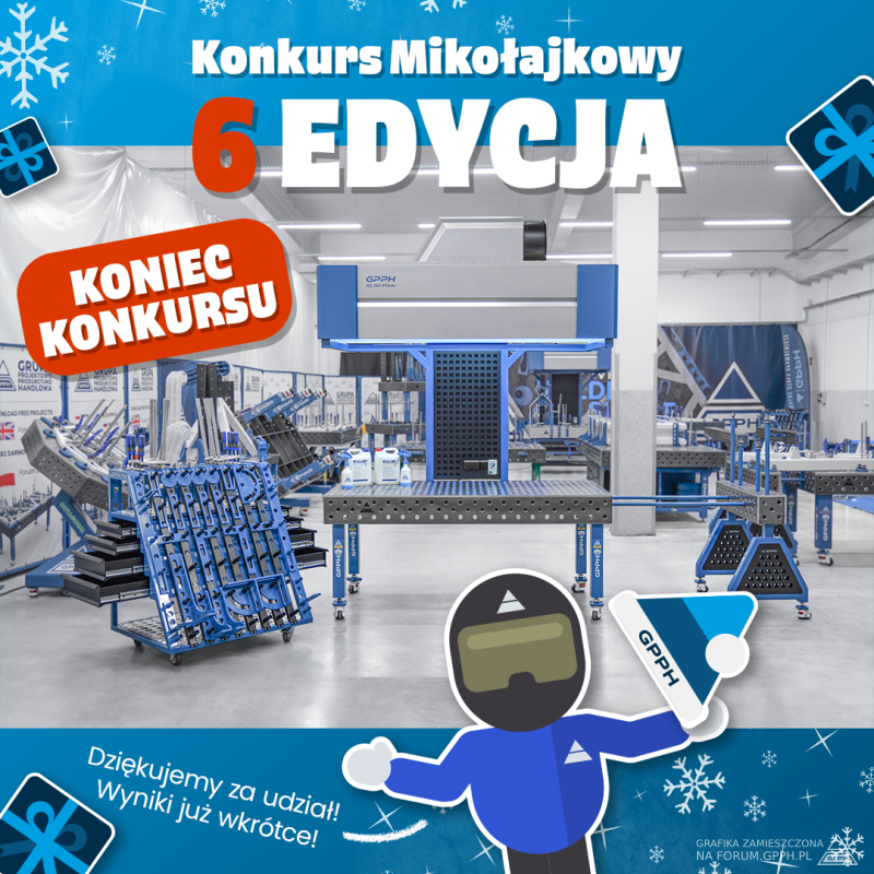 Główną nagrodą 6 edycji konkursu jest STÓŁ SPAWALNICZY PLUS o wymiarze 2000x1000 mm z otworami fi 28 mm w siatce diagonalnej z nogami na kołach, OKAP SPAWALNICZY GPPH IQ AirFlow o wymiarze 2000x1000 mm z wbudowanym wentylatorem wraz z ramą do zamontowania okapu, WÓZEK NARZĘDZIOWY L z szufladami, Zestaw narzędzi PLUS nr 3, Podpora spawalnicza TRESTLE o wymiarze 1000x200x200 z nogami na kołach, trzy różne zestawy (w zestawie 2 szt.) ŁĄCZNIKÓW do stołów spawalniczych: o wymiarach 300 mm, 500 mm i 1000 mm, a także zestaw produktów chemicznych GPPH CHEM: 5l PROTECTOR, 5l HD Cleaner i 2x Spryskiwacz - całość o wartości aż 51 807,60 ZŁ BRUTTO!🚀😱